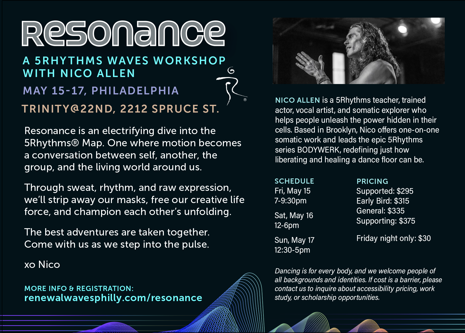 This one is a brand for my other business! I develop and manage the marketing and brand presence for Renewal Waves Philadelphia, a bimonthly 5Rhythms class that I co-produce. My partner and I curate a rotation of guest teachers from NYC and beyond. I am the visual design and marketing lead, shaping how the work is presented across social media, email, event pages, and print materials. My focus is on creating a clear and consistent identity that reflects the depth, accessibility, and integrity of the practice, while making each offering easy to understand and inviting to attend. This includes visual design, tone of voice, messaging, and the overall structure of how classes and workshops are introduced to the community.