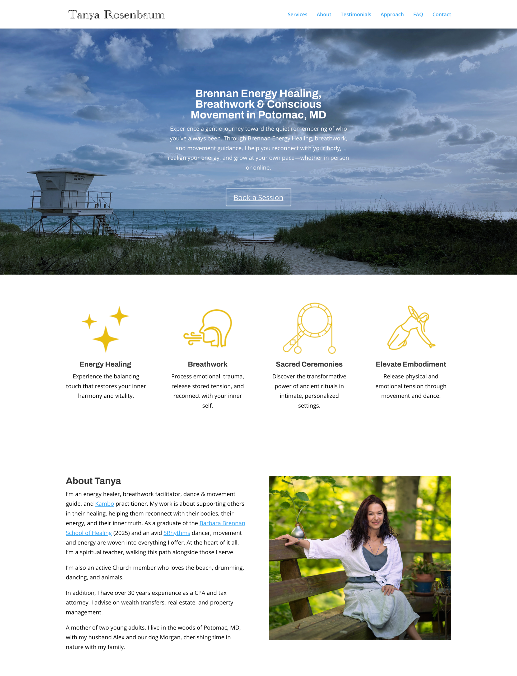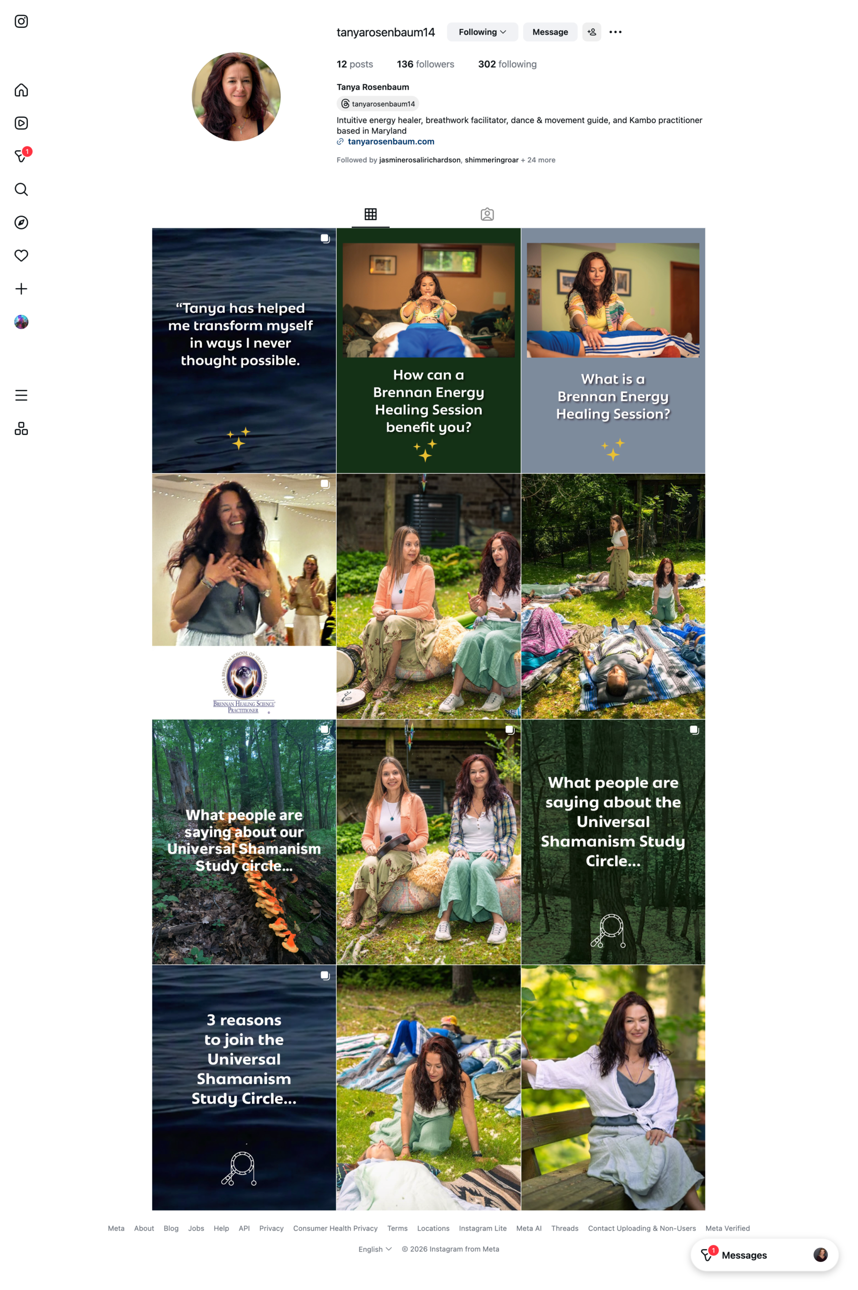 I partnered with Tanya Rosenbaum, a Brennan Energy Healer, to create a focused one-page website designed to clarify her offerings and improve her search visibility. We built a simple WordPress site with jump links to organize content across movement, breathwork, energy healing, and shamanism, and developed SEO-rich copy that quickly moved her from being nearly invisible on Google to ranking easily for Brennan Energy work in Maryland. As her practice grew, I also supported her social media strategy for the launch of a Universal Shamanism study circle, and created branded graphics for a clean, consistent Instagram grid to introduce her services and build recognition.